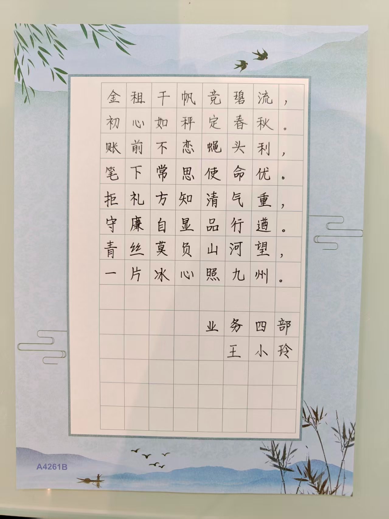 作品簡介:這幅書法以“清風盈正氣,廉潔守初心”為主題,筆墨清朗,風骨錚錚,如金融之舟行于碧水,唯清風可揚帆,唯正氣能定向。字里行間,廉而不冽,潔而不孤,初心若錨,穩泊于喧囂之外。懸于廳堂,不指一事一物,卻使萬端生意皆在靜默中自律;觀于片刻,可令心塵頓洗,長留清輝。讓清風穿過年報,讓正氣充盈合同,以租賃之筆,畫金融凈土。愿我司與同業共沐此風,市場浩瀚,皆成清流。