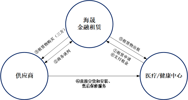 ①直接租賃:由醫院/健康中心選擇醫療器械和供應商,海晟金租購買選定醫療器械提供給醫院/健康中心使用,醫院/健康中心按期支付租金。租賃期滿,醫院/健康中心以較低名義貨價回購醫療器械。